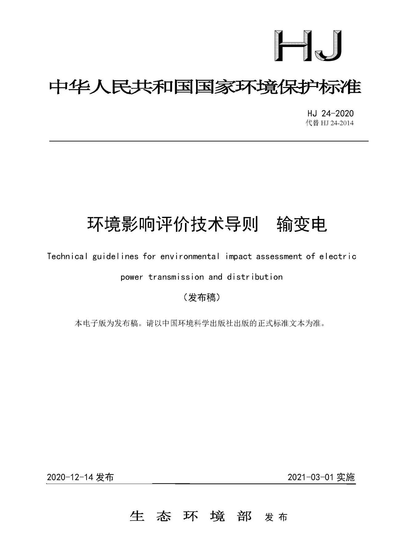 《環(huán)境影響評(píng)價(jià)技術(shù)導(dǎo)則 輸變電》(HJ 24-2020)