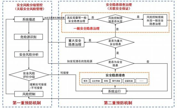 如發(fā)現(xiàn)重大安全隱患,應(yīng)按照8.3的要求進行治理;如發(fā)現(xiàn)一般安全隱患,應(yīng)當(dāng)按照8.4的要求進行治理;排查中如發(fā)現(xiàn)潛在的危險源,應(yīng)回溯到“7.2系統(tǒng)描述”進行定位和梳理,適時啟動安全風(fēng)險分級管控流程識別危險源并管控相關(guān)風(fēng)險;如評估發(fā)現(xiàn)的問題不屬于上述任何一類,可選擇是否改進后,回到系統(tǒng)運行環(huán)節(jié)。