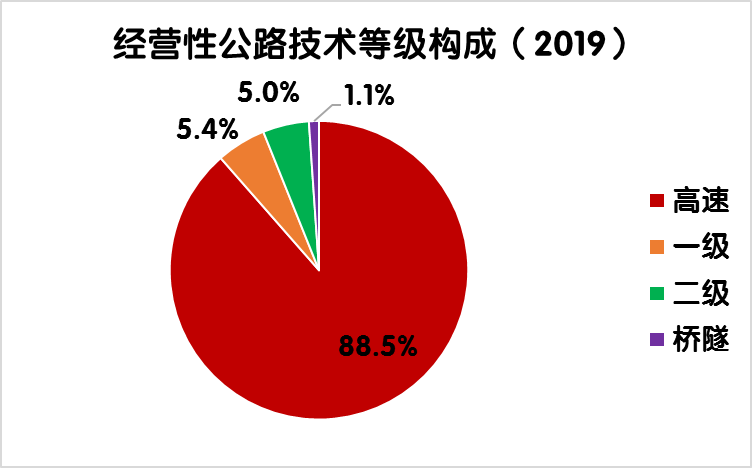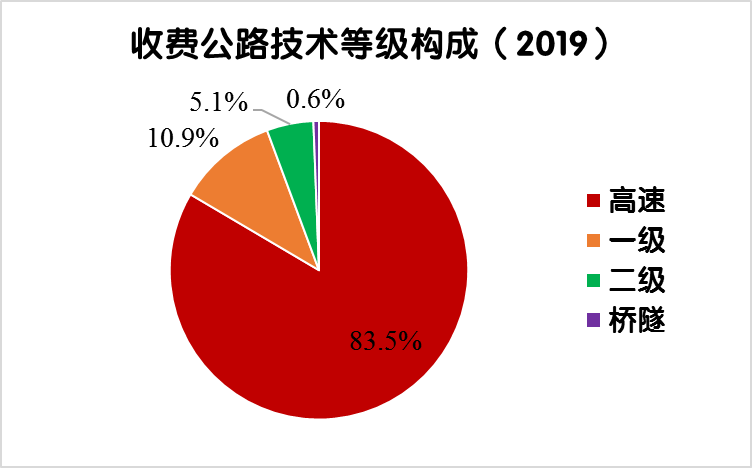 2019年末,全國收費(fèi)公路里程17.11萬公里,占公路總里程501.25萬公里的3.4%。其中,高速公路14.28萬公里,一級公路1.86萬公里,二級公路0.87萬公里,獨(dú)立橋梁及隧道1024公里,占比分別為83.5%、10.9%、5.1%和0.6%。