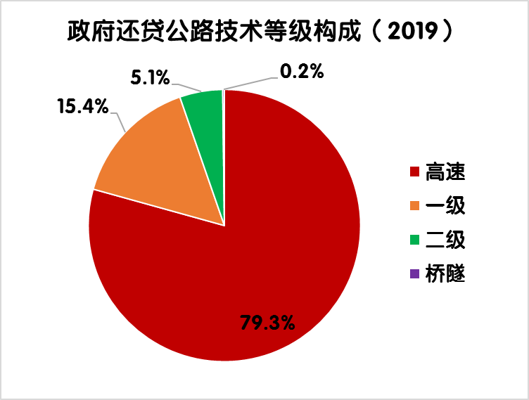 2019年末,全國政府還貸公路里程9.39萬公里,占全國收費(fèi)公路里程的54.9%。其中,政府還貸高速公路7.45萬公里,一級公路1.44萬公里,二級公路0.48萬公里,獨(dú)立橋梁及隧道186公里,占比分別為79.3%、15.4%、5.1%和0.2%。政府還貸高速公路占收費(fèi)高速公路里程的52.1%。