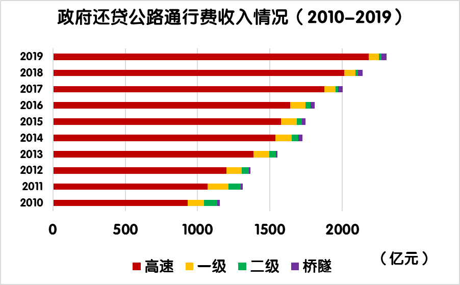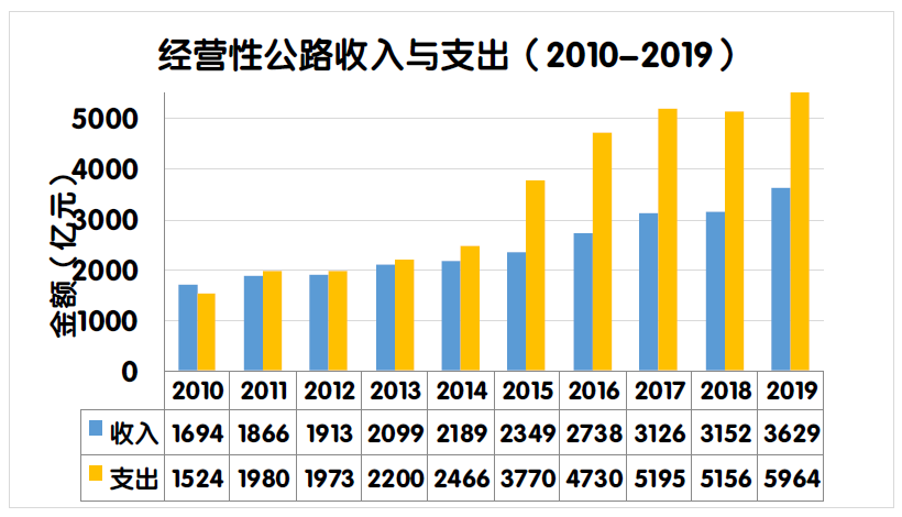 2019年度,全國經(jīng)營性公路收支平衡結(jié)果為-2334.9億元。其中,經(jīng)營性高速公路收支缺口2284.7億元,一級公路收支缺口53.1億元,二級公路收支缺口3.7億元,獨(dú)立橋梁及隧道收支盈余6.6億元。