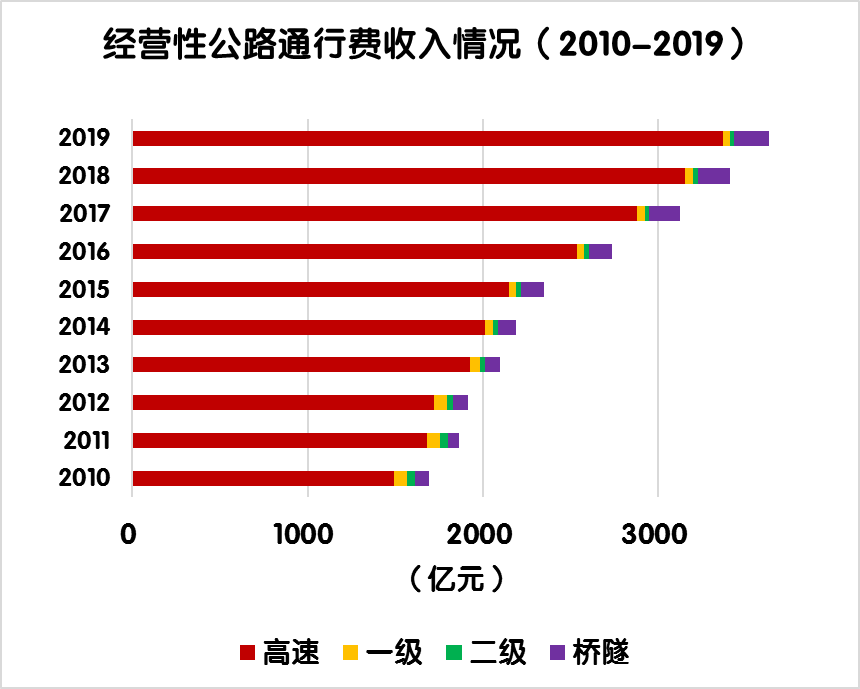 與上年相比,經(jīng)營性公路車輛通行費(fèi)總收入由3410.1億元增加到3628.9億元,凈增218.7億元,增長6.4%。其中,高速公路由3152.4億元增加到3368.1億元,凈增215.7億元,增長6.8%;一級公路由48.0億元減少到41.9億元,凈減6億元,下降12.6%;二級公路由25.4億元減少到23.5 億元,凈減1.9億元,下降7.6%;獨(dú)立橋梁及隧道由184.3億元增加到195.3億元,凈增11億元,增長6.0%。