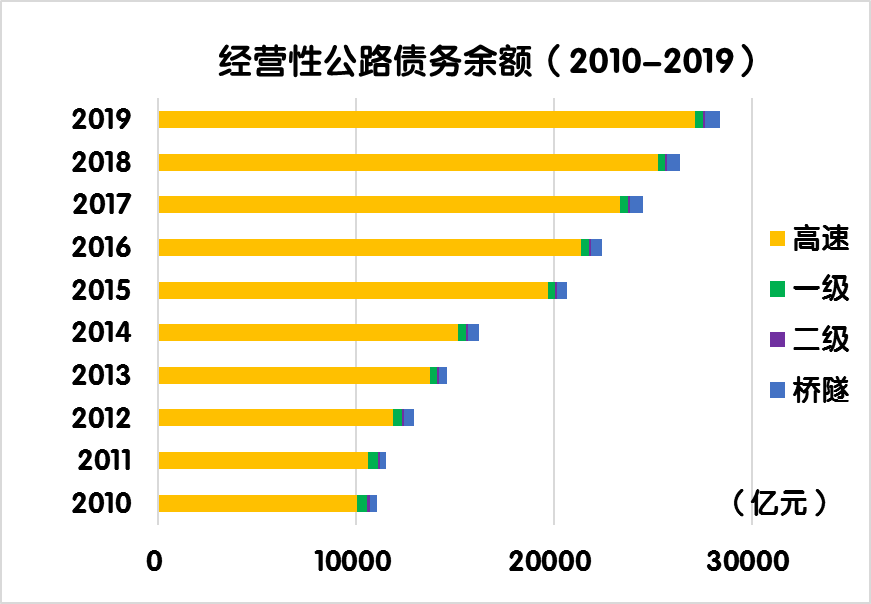 2019年末,經(jīng)營性公路債務(wù)余額28387.6億元,占收費(fèi)公路債務(wù)余額的46.1%。其中,經(jīng)營性高速公路債務(wù)余額27154.9億元,一級公路403.1億元,二級公路63.5億元,獨(dú)立橋梁及隧道766.1億元,占比分別為95.7%、1.4%、0.2%和2.7%。