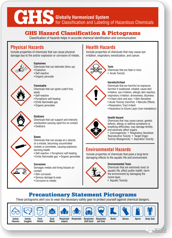化學(xué)品由于其固有的化學(xué)、物理和毒理學(xué)特性,對(duì)人員的健康和安全構(gòu)成危害?;瘜W(xué)品可分為幾種不同的危險(xiǎn)類別。危險(xiǎn)等級(jí)將決定類似材料應(yīng)如何儲(chǔ)存和處理,以及需要什么特殊設(shè)備和程序來安全使用它們。每個(gè)化學(xué)容器,無論是由供應(yīng)商提供還是在實(shí)驗(yàn)室生產(chǎn),都必須包括標(biāo)簽,清楚地識(shí)別與該化學(xué)物質(zhì)相關(guān)的危害。通過參考該化學(xué)品的SDS可以找到該化學(xué)品的更詳細(xì)的危害信息。