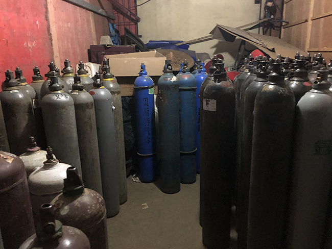 浙江杭州市案例:2021年3月8日上午,浙江省杭州市蕭山區(qū)應(yīng)急管理局執(zhí)法人員對(duì)某公司進(jìn)行執(zhí)法檢查。期間,執(zhí)法人員發(fā)現(xiàn)廠區(qū)內(nèi)一簡(jiǎn)易鋼棚搭設(shè)的倉(cāng)庫(kù),玻璃窗均被物體人為遮擋,檢查發(fā)現(xiàn)倉(cāng)庫(kù)內(nèi)堆放了大量?;?,包括滿瓶二氧化碳、氧氣、乙炔、混合氣體、氮?dú)獾?span style="margin-bottom: 37px;line-height: 37px;font-size: 21px">176個(gè)氣瓶。同時(shí),該倉(cāng)庫(kù)緊鄰公司員工宿舍樓搭設(shè),宿舍樓里還住著數(shù)十個(gè)工人,一旦發(fā)生爆炸,后果不堪設(shè)想。