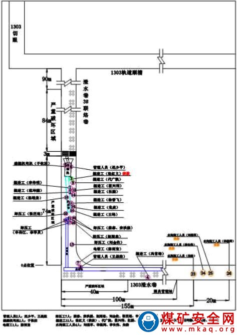 事故當(dāng)班,綜掘隊和防沖項目部在 1303 工作面泄水巷及 3 號聯(lián)絡(luò)巷施工。