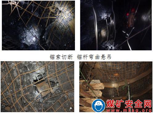 拉伸頸縮,表明巷道破壞瞬間錨桿、錨索承受了水平載荷作用,頂部煤體在水平?jīng)_擊載荷作用下發(fā)生碎脹變形,可以推斷頂煤冒落的主要原因是在破壞瞬間,巷道頂部煤體在沖擊載荷作用下發(fā)生碎脹變形,導(dǎo)致錨桿、錨索無法對其進行有效約束。