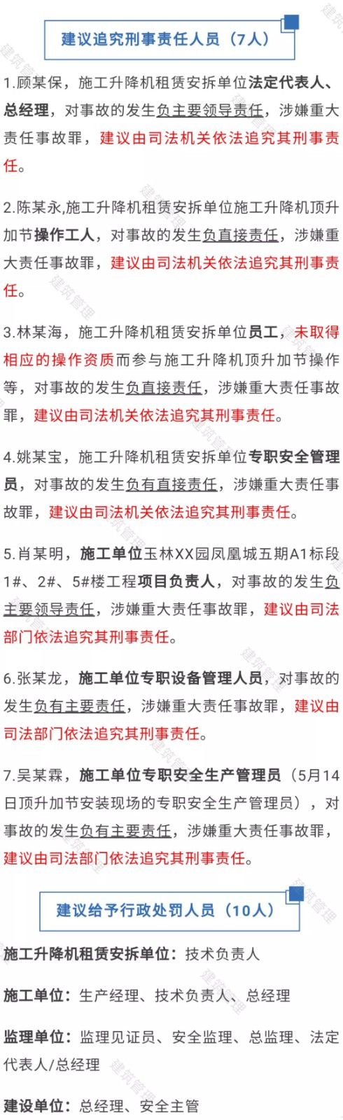 玉林升降機(jī)墜落致6人死亡!項目負(fù)責(zé)人安全員等7人被追刑責(zé)!10人被處罰!調(diào)查報告公布