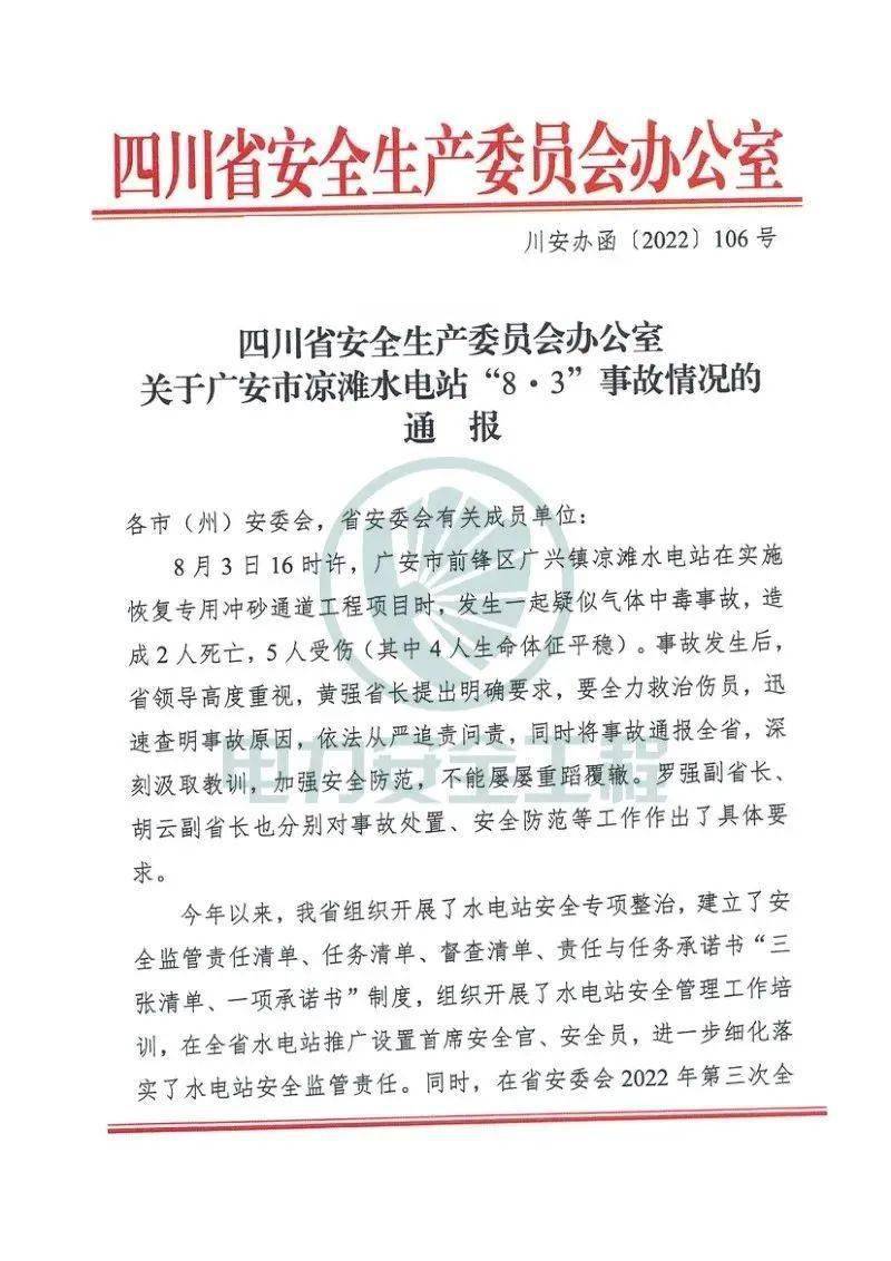 2022年8月3日,四川省廣安市前鋒區(qū)廣興鎮(zhèn)涼灘水電站在實(shí)施恢復(fù)專用沖砂通道工程項(xiàng)目過(guò)程中,發(fā)生中毒事故,造成3人死亡,4人受傷。