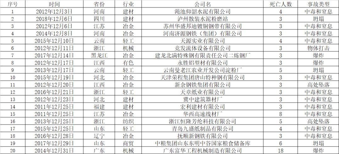 2011年至2017年的12月份,工貿行業(yè)共發(fā)生較大及以上事故20起、死亡90人,中毒和窒息事故共11起、死亡41人,事故起數和死亡人數分別占55%和45%。其中2014年12月31日,廣東富華工程機械制造有限公司發(fā)生1起因爆炸,導致死亡18人的重大事故。