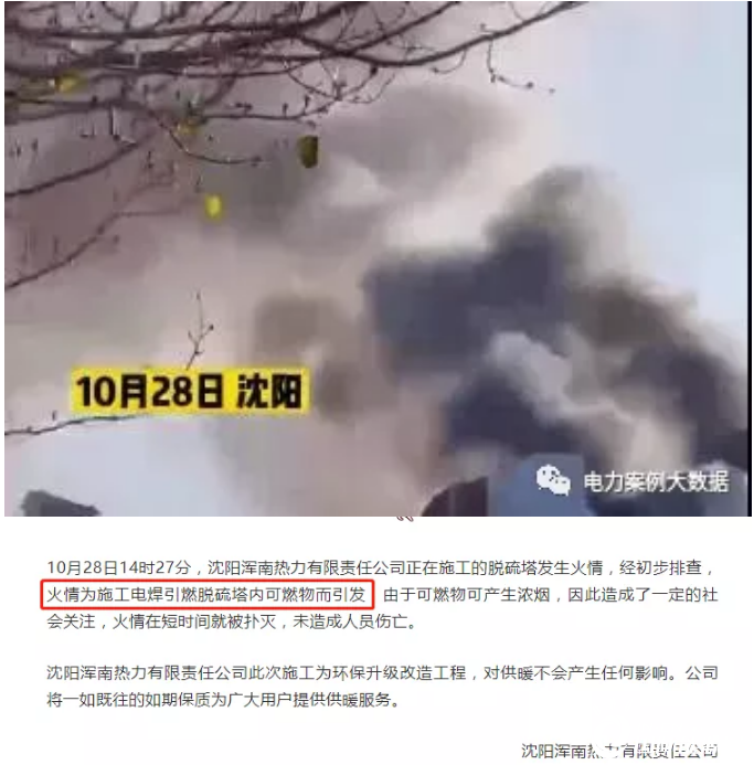10月28日14時(shí)27分,沈陽渾南熱力有限責(zé)任公司正在施工的脫硫塔發(fā)生火情,經(jīng)初步排查,火情為施工電焊引燃脫硫塔內(nèi)可燃物而引發(fā),由于可燃物可產(chǎn)生濃煙,因此造成了一定的社會(huì)關(guān)注,火情在短時(shí)間就被撲滅,未造成人員傷亡。