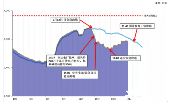5月13日14時37分,興達電廠因接入345千伏路北變電站母線故障,導致電廠電力送出受阻,兩臺燃煤及兩臺燃氣機組脫網(wǎng),系統(tǒng)損失有效電力供應(yīng)約220萬千瓦,造成臺灣系統(tǒng)頻率驟降,為維持電網(wǎng)穩(wěn)定,電力系統(tǒng)在第一時間自動啟動低頻卸載約300萬千瓦。臺電評估短時間內(nèi)無法立即復(fù)電,為維系電力系統(tǒng)安全,自下午3時起執(zhí)行緊急分區(qū)輪流停電,最大限電達到350萬千瓦。事故過程系統(tǒng)負荷變化曲線下圖所示。