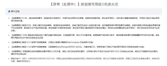 火災(zāi)公告顯示,11日凌晨01:46,接當(dāng)?shù)叵酪?,因消防澆水持續(xù)進(jìn)行,機(jī)房開始出現(xiàn)積水和滲漏,電路存在短路風(fēng)險(xiǎn),新加坡可用區(qū)C一棟?rùn)C(jī)房大樓整體緊急斷電,可用區(qū)C其他大樓業(yè)務(wù)網(wǎng)絡(luò)已陸續(xù)恢復(fù)。
