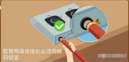 請使用專用燃氣膠管,長度不超過2米、使用時間不得超過兩年、無老化破損的情況。膠管與氣瓶減壓閥、灶具、熱水器的接口處必須加裝管箍鎖緊,防止因膠管松動出現(xiàn)煤氣泄漏。