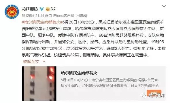 據(jù)@龍江消防:#哈爾濱民生尚都著火#5月26日18時(shí)23分,黑龍江省哈爾濱市道里區(qū)民生尚都祥園9號(hào)樓2單元16層發(fā)生爆炸,哈爾濱市消防支隊(duì)立即調(diào)派立即調(diào)派群力中隊(duì)、群西中隊(duì)、顧?quán)l(xiāng)中隊(duì)、愛(ài)建中隊(duì)17輛消防車(chē)、68名消防員趕赴現(xiàn)場(chǎng)撲救,支隊(duì)全勤指揮部遂行出動(dòng),并通知公安、醫(yī)療、燃?xì)?、?yīng)急局聯(lián)動(dòng)力量協(xié)助處置。19時(shí)05分現(xiàn)場(chǎng)明火被全部撲滅,過(guò)火面積約60平方米,造成2人死亡。據(jù)初步了解,事故系燃?xì)獗ㄒ?。該建筑?2層,鋼混結(jié)構(gòu)。
