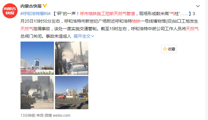 3月25日13時50分左右,呼和浩特市新世紀(jì)廣場附近呼和浩特地鐵一號線博物館(舊)站口工地發(fā)生天然氣泄漏事故,該處一度實(shí)施交通管制。