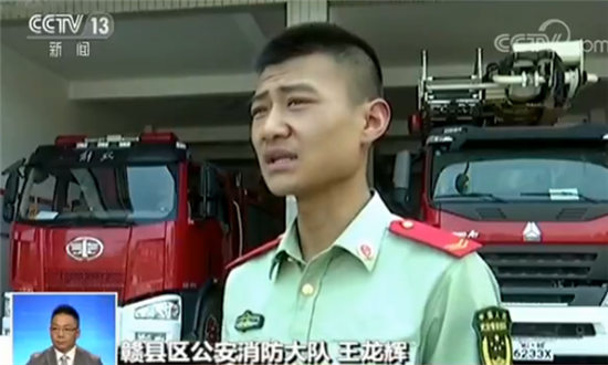5月23日下午3點多,江西省贛州市贛縣區(qū)城南大道的濱江花城小區(qū)有一居民樓突發(fā)火災,現(xiàn)場熊熊大火,直冒濃煙,接到報警后,王龍輝和隊員們迅速趕往現(xiàn)場進行滅火。