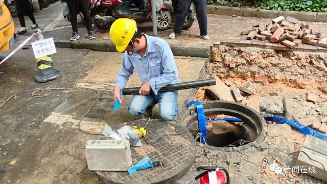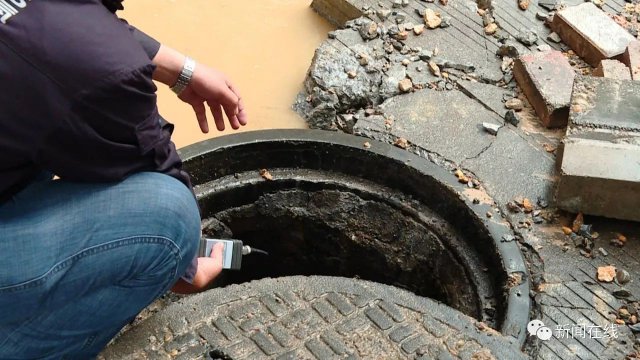 先不要敲,先不要敲,我們查一下濃度先,要不等一下(有)火花(發(fā)生)爆炸,這是雨水井啊,測一下濃度。這是雨水井,雨水井如果有氣進(jìn)去了同樣會(huì)爆炸,現(xiàn)在地下也是有,還是有是吧,等一下散了才能敲。