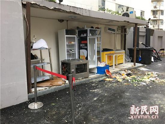 今天上午,新民晚報記者在事發(fā)現(xiàn)場看到,新閘路1039弄弄口人行道上,一臺挖掘機已對受損管道區(qū)域進行開挖,現(xiàn)場有燃氣搶修車及搶修人員。而一旁弄堂門口的一間儲物倉庫內的冰箱、空調等物品在事故中損壞,冰箱內的食物散落一地。此外,弄堂旁的一幢大樓外的PVC材質的落水管斷裂,一片狼藉。據稱,現(xiàn)場一度曾有明火。