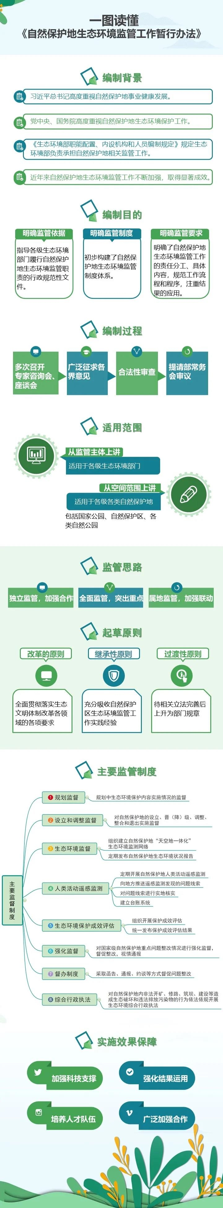 在這樣的背景下,生態(tài)環(huán)境部組織編制了《暫行辦法》,是深入貫徹習(xí)近平生態(tài)文明思想,有效落實(shí)黨中央國務(wù)院關(guān)于自然保護(hù)地事業(yè)改革各項(xiàng)重大部署,切實(shí)履行自然保護(hù)地生態(tài)環(huán)境監(jiān)管職責(zé)的重要舉措。其主要目的,一是明確監(jiān)管依據(jù) ,《暫行辦法》是指導(dǎo)各級生態(tài)環(huán)境部門履行自然保護(hù)地生態(tài)環(huán)境監(jiān)管職責(zé)的行政規(guī)范性文件;二是明確監(jiān)管制度,《暫行辦法》初步構(gòu)建了自然保護(hù)地生態(tài)環(huán)境監(jiān)管制度體系;三是明確監(jiān)管要求, 《暫行辦法》明確了自然保護(hù)地生態(tài)環(huán)境監(jiān)管工作的責(zé)任分工、具體內(nèi)容,規(guī)范工作流程和程序,注重結(jié)果的應(yīng)用。